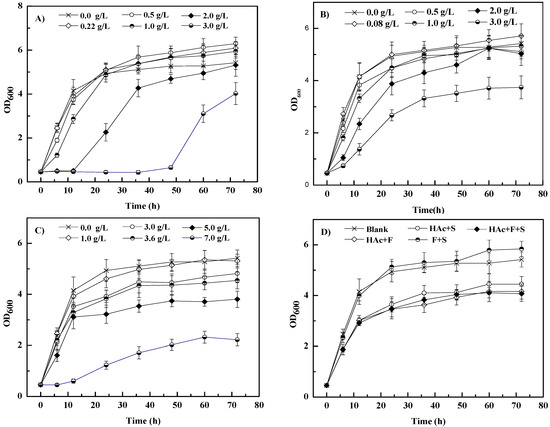 The individual and combined effects of furfural (0–3.0 g/L), acetic acid (0–7.0 g/L), and syringaldehyde (0–3.0 g/L) on the growth of S. cerevisiae 1517RM are shown in Figure 1. As shown in Figure 1A, the lag phase of S. cerevisiae 1517RM was slightly affected with furfural less than 1.0 g/L, which was consistent with the result of a previous study carried out by da Silva et al. using S. carlsbergensis ATCC 6269 [37]. Along with the increase in furfural content, the lag phase was remarkably prolonged by 48 h (3.0 g/L furfural group). Interestingly, compared with the blank group (0 g/L furfural), a slight increase in biomass yield was observed over time (>24 h) in the 0.22, 0.5, and 1.0 g/L furfural groups after 72 h (Table 3). Previous studies showed that a slight increase in biomass yields using Thermoanaerobacter pseudethanolicus 39E [38] and Candida tropicalis [39] as biocatalysts was achieved at furfural ~1.0 g/L, indicating that a low concentration of furfural may play a role as a growth additive rather than an inhibitor. It was also reported that microbes can tolerate low titers of furfural and convert them to less toxic compounds such as furfuryl alcohol and furoic acid [40]. Furthermore, the reduction in furfural can partially replace glycerol formation, regenerate hydrogen receptor NAD+, limit carbon loss to by-products, and allow more carbon distribution of biomass synthesis [39,41].