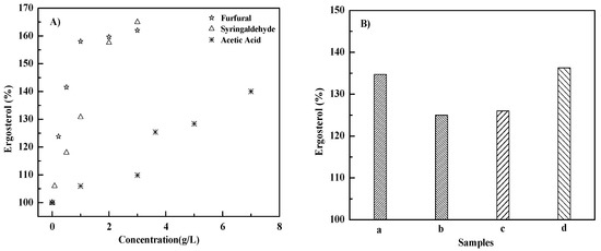 Effects of inhibitors on ergosterol at 72 h. (A) Individual inhibitor group; (B) Inhibitor cocktails. a–d represents cocktail of 3.63 g/L acetic acid + 0.22 g/L furfural, 3.63 g/L acetic acid + 0.08 g/L syringaldehyde, 0.22 g/L furfural + 0.08 g/L syringaldehyde, and 3.63 g/L acetic acid + 0.22 g/L furfural + 0.08 g/L syringaldehyde, respectively.