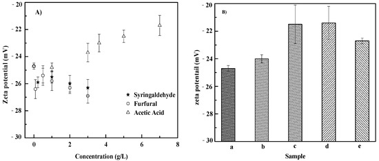 Effects of inhibitors on zeta potential at 72 h. (A) Individual inhibitor group; (B) Inhibitor cocktails. a–e represent the group of blank, cocktail of 3.63 g/L acetic acid + 0.22 g/L furfural, 3.63 g/L acetic acid + 0.08 g/L syringaldehyde, 0.22 g/L furfural + 0.08 g/L syringaldehyde, and 3.63 g/L acetic acid + 0.22 g/L furfural + 0.08 g/L syringaldehyde, respectively.