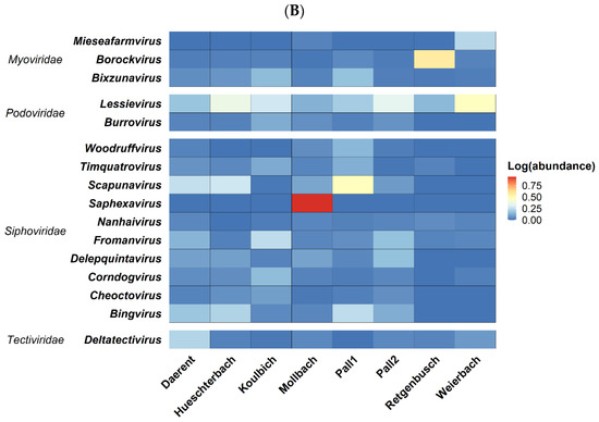 To visualise the composition of the DNA bacteriophage population, a heatmap on the log-transformation abundances, at the genus level, was performed on the 10 most abundant genera, all sites included (Figure 3B). Genus Lessievirus (Podoviridae) was detected in every site, and more specifically in the soil of Weierbach, for which Mieseafarmvirus (Myoviridae) was also present. The soil of Mollbach was specifically represented by Saphexavirus (Siphoviridae), while in Retgenbusch, Borockvirus (Myoviridae) was the most abundant genus. Pall 1 was found to be mainly represented by Scapunavirus (Siphoviridae) followed by Bingvirus (Siphoviridae). Scapunavirus was also found in a slightly higher abundance in Daerent and Hueschterbach. Koulbich and Pall 2 did not display high abundances for specific genera, but still showed the presence of Fromanvirus (Siphoviridae) besides Lessievirus.