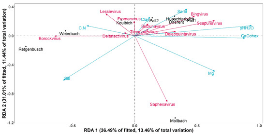 Along the RDA1 axis, both soil pH and calcium concentration explained the sites distributions. Indeed, Weierbach and Retgenbusch were displayed apart from the other sites, as they were the most acidic soils (pH = 4.1 and 4.5, respectively) and had the lowest concentration in calcium (Ca2+ = 21 and 16 positive charges per kg of soil, respectively). The RDA showed a particular correlation between the sites of Weierbach and Retgenbusch and the genus Borockvirus. On the contrary, Pall 1, Huescherbach and Daerent presented the highest soil pH (pH = 6.8, 6.4 and 6.3, respectively) with relatively high concentrations of calcium (Ca2+ = 166, 126 and 87 positive charges per kg of soil, respectively). In terms of DNA bacteriophage genera, these soil properties (i.e., pH and Ca2+) showed a negative correlation with Bingvirus and Scapunavirus. Finally, Mollbach showed a particular distribution, related to the magnesium content, as indeed its soil presented the highest concentration of magnesium (Mg = 52 mg/100 g of soil). Additionally, Saphexavirus displayed a positive correlation specifically to the magnesium concentration.
