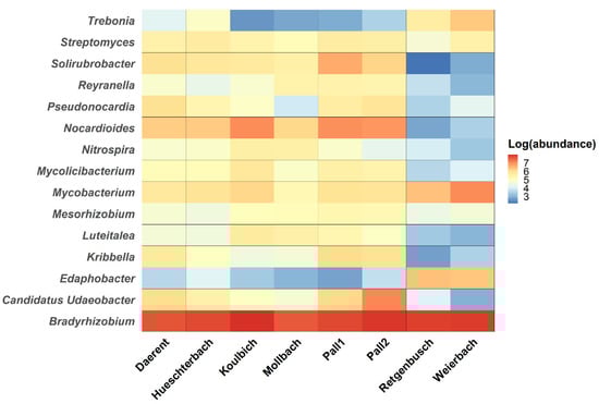Heatmap of the most occurrent bacterial genera identified (selection with a log-abundance above 3) as a function of the sites. The gradient represents the log-transformed abundance of the genera, where red colour represents the most abundant genera and blue, the least ones.
