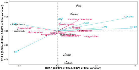 In addition, these two sites showed differences in bacterial compositions from the other sites. Indeed, Regtenbusch and Weierbach showed higher abundance for the genera Trebonia, Edaphobacter and Mycobacterium, for which the relative abundances were lower in the other soils. Regarding the other genera, with the exception of Streptomyces and Bradyrhizobium, all of them showed high abundance for all sites except for Regtenbusch and Weierbach. Finally, Streptomyces and Bradyrhizobium, were detected in every soil with the highest abundance reported for the latter. The differences in bacterial community composition between the sites were studied through a PERMANOVA test, performed on the bacteria genera abundance. As noticed for the DNA bacteriophages, the vegetation (i.e., forest and grasslands) did not significantly impact the bacteria distribution (p-value = 0.121, α = 0.05). In addition, soil pH and calcium concentration also displayed significant effect on the bacterial compositions between the sites (p-value = 0.006 and 0.002, respectively, α = 0.05). Contrary to the observations on the DNA bacteriophages, magnesium concentration played a significant role on the bacterial composition (p-value = 0.027, α = 0.05). As for the DNA bacteriophage investigation, RDA was carried out to analyse the variations of bacterial genera depending on the same selected soil properties of the sites (Figure 6). The RDA was built over the two first dimensions, covering together 93.77% of the fitted variation. Among all the abiotic factors, soil pH was the sole explanatory variable that had a significant weight on the construction of the RDA (p-value = 0.01, α = 0.05). On one hand, the axis RDA1 was significantly correlated at 92.16% with soil pH (p-value < 0.01, α = 0.05) and at 79.21% with calcium (p-value < 0.01, α = 0.05). On the other hand, the RDA2 was not significantly correlated with any of the tested soil properties. Weierbach and Retgenbusch were found apart from all the other sites, and both related to only Edaphobacter and Mycobacterium.