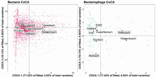 Symmetric co-correspondence analysis (Sym-CoCA) of both total bacteria and DNA bacteriophage community compositions. The bacterial genera are represented in pink and bacteriophage genera, in blue. Here, they were built over the two first dimensions, where 77.42% of the fitted covariation between the two matrices was explained by COCA1 and 10.13% by COCA2. The sites are displayed in black.