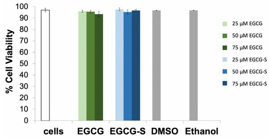 A determinant of cytotoxicity of EGCG or EGCG-S to Vero cells is to quantitatively determine the effect on cell viability by using the Trypan blue assay. The effect on cell proliferation was measured with the WST-1 reagent after 24 h of treatment (Roche Diagnostics, Indianapolis, IN, USA). The percentage of cellular growth was calculated relative to untreated Vero cells as the control (100% growth). Cell viability assays (Figure 1) show that concentrations up to 75 μM of EGCG and EGCG-S do not have major effects on the viability of Vero cells. Cell viability assays indicate that there is a slight decrease in the number of viable cells with increasing concentrations of EGCG and EGCG-S (all above 90% viability). The study also indicated that there were no observed effects of dissolving EGCG or EGCG-S in either ethanol or DMSO; therefore, further studies were continued by using only DMSO as the solvent at the following percentages (0.5%, 1%, and 1.5%, in 25, 50, and 75 μM concentrations, respectively).