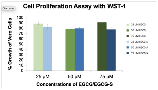 The cell proliferation assays (Figure 2) confirm that EGCG and EGCG-S do not have major effects on the proliferation of Vero cells. The cells treated with EGCG or EGCG-S resulted in a minimum of 80% cell proliferation compared to the untreated Vero cells (100%). This indicated that these compounds do not have a toxic effect on Vero cells at the concentrations tested.