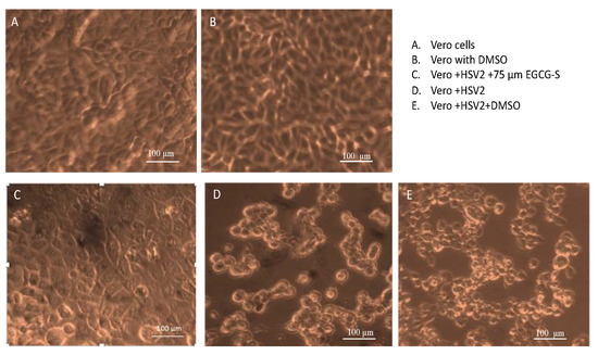 Vero cells were plated in 6-well plates and were infected with HSV-2 treated with 75 µM EGCG-S, 75 µM EGCG, or nontreated HSV-2 (MOI = 0.1) for one-hour incubation, with intermittent rocking at 37 °C and 5% CO2. Analysis of cell morphology was previously described in De Oliveira et al. [37]. The effect of virus infection was compared to the uninfected Vero cells control. After one hour, the unadsorbed virus was aspirated and 2.5 mL of media was added to each well and incubated at 37 °C and 5% CO2 for 48 h. Morphological changes were observed at day 2 post-infection by using an inverted microscope.