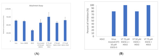 ToxGlo™ attachment assay with Vero cells infected at 4 °C with HSV-2 (MOI = 0.1) pretreated for one hour with 50 µM EGCG-S, 75 µM EGCG-S, 50 µM EGCG, and 75 µM EGCG, and Vero cells infected with untreated HSV-2 as control at 4 °C. (A) The antiviral effects of EGCG-S on the binding step of the viral cycle are reported. Cell viability was measured by the luminescence of Vero cells following infection with HSV-2 treated with 50 and 75 µM concentrations of EGCG and EGCG-S, respectively. (B) The results of the percent inhibition resulting from the treatment of HSV-2 with 50 and 75 µM concentrations of EGCG and EGCG-S are reported. Seventy-five µM concentrations of EGCG and EGCG-S, respectively, resulted in 100% inhibition of attachment to Vero cells.