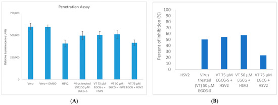 ToxGlo™ penetration assay with Vero cell monolayers infected with HSV-2 (MOI = 0.1) in the presence of 50 µM EGCG-S, 75 µM EGCG-S, 50 µM EGCG, and 75 µM EGCG, respectively. Unadsorbed virus was deactivated with PBS (pH 3) for 1 min and PBS (pH 11) to neutralize the acidic pH. Treatment of HSV-2 with 50 µM and 75 µM concentrations of EGCG and EGCG-S had some effect on the penetration step of the infection process. (A) Cell viability as measured by luminescence 48 hpi indicates that treatment of virions with 50 and 75 µM concentrations of EGCG and EGCG-S increased cell viability compared with untreated HSV-2. (B) The percent inhibition of penetration stage of HSV-2 infection when virions were treated with 50 and 75 µM concentrations of EGCG and EGCG-S is reported.