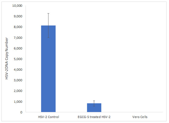The effect of treatment of HSV-2 virions with EGCG-S was also quantitively determined by measuring the viral DNA yields by using a qPCR-based assay. The viral DNA concentrations in HSV-2 cultures treated with 75 µM EGCG-S and in untreated virus control were calculated and shown in Figure 7. The copy number of HSV-2 DNA showed a prominent decline in cultures infected with EGCG-S pre-treated HSV-2 compared to those of untreated virus controls. This assay demonstrated ~90% inhibition of HSV-2 proliferation when the HSV-2 virions were treated with EGCG-S prior to infection of Vero cells (p < 0.0001). No viral DNA was detected in non-infected cells which served as the negative control.