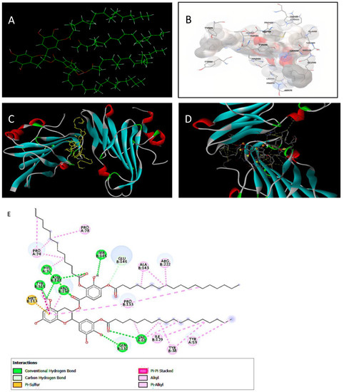 Bioinformatic analysis of the interaction of HSV-2 glycoprotein D (gD) and EGCG-S. (A) 3D Structure of EGCG-S in VegaZZ; (B) Predicted binding interaction between EGCG-S and glycoprotein D based on AutoDock Vina analysis; (C) Ribbon model of binding between glycoprotein D and EGCG-S; (D) Enhanced ribbon image of binding between glycoprotein D and EGCG-S; (E) Two-dimensional diagram of receptor-ligand interactions including conventional hydrogen bonds (green), van der Waals (light green), pi-sulfur (yellow), pi–pi stacked (dark pink), alkyl and pi-alkyl (pink).