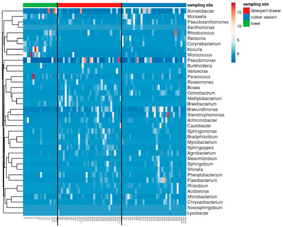 Heatmap showing the main genera present at the different sampling sites. Figure shows “best hits” (i.e., 50% relative frequency) of the metagenome analysis (n = 32 towels, 42 detergent drawer, and 46 rubber sealants).