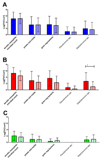 For the determination of the bacterial counts, a decimal dilution series was prepared and 100 µL of each sample was spread on Tryptic Soy Agar to detect aerobic mesophilic bacteria (TSA, Merck KGaA, Darmstadt, Germany), Malt Extract Agar to detect yeasts and moulds (MEA, Merck KGaA, Darmstadt, Germany), MacConkey to detect Gram-negative bacteria (Merck KGaA, Darmstadt, Germany), Mannitol Salt Agar to detect Staphylococcus spp. (MSA, Xebios Diagnostics GmbH, Düsseldorf, Germany), and Cetrimide Agar to detect Pseudomonas spp. (Xebios Diagnostic GmbH, Düsseldorf, Germany)). Incubation was performed at 30 (MEA, MSA, and Cetrimide) or 37 °C (TSA, MacConkey).