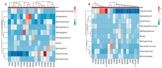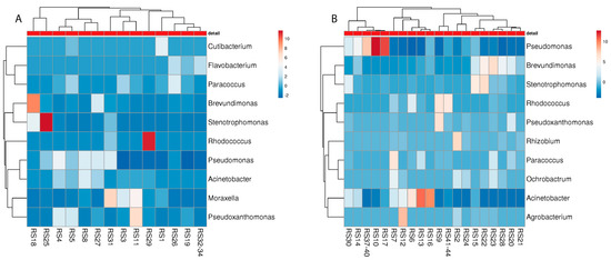 Heatmap of the “best hits” (fractions > 1% of the total quantity) of the bacterial genera identified in the metagenome analysis in different rubber sealants of malodour ((A); n = 16) and no odour ((B), n = 26) households. The number of samples shown may differ from the true sample quantity, as individual samples were pooled in the metagenome analysis.