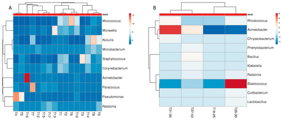 Heatmap of the “best hits” (fractions > 1% of the total quantity) of the bacterial genera identified in the metagenome analysis of different towels of malodour ((A); n = 16) and no-odour ((B), n = 26) households. The number of samples shown may differ from the true sample quantity, as individual samples were pooled in the metagenome analysis.