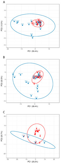 Principle component analysis (PCA) of the different sampling sites ((A): detergent drawer; (B): rubber sealant; (C): towel M and (red, n = 16) and NM (blue, n = 26) households. The number of samples shown may differ from the true sample quantity, as individual samples were pooled in the metagenome analysis.