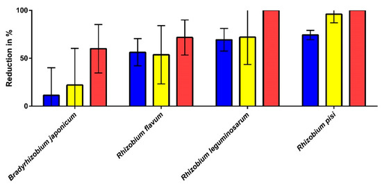 Malodour reduction by Bradyrhizobium and Rhizobium strains for general malodour (blue), cheesy odour (yellow), and pungent odour (red) using the malodour model described in [26] (n = 5). All reductions shown are in comparison to the positive control (very high proportion of the three odour attributes). The samples were evaluated by a trained sniffer panel. The error bars have been shortened to the bottom for reasons of clarity.