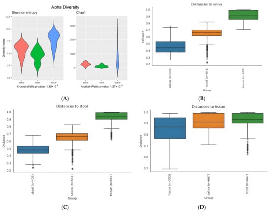 The tissue sample group showed the most varied result in Shannon entropy and Chao1 indexes, with widely spread values (the highest maximum (over 3000) and median in Chao1 and the highest maximum and median in Shannon entropy). The Kruskal–Wallis p-value was 1.85e-8 for Shannon entropy and 1.57 × 10−9 for Chao1, which indicates a statistically significant difference in the median of each sample group (Figure 1A).