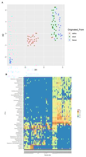 Normalized abundances of each OTU among samples were projected on UMAP (Figure 3A) and a heatmap (Figure 3B) based on values that were calculated by the natural log of raw OTU counts plus one pseudo count, resulting in a clearly separated saliva sample group from stool and tissue groups. The composition of the strains of OTU were appropriate to their environmental conditions; tissue and stool sample groups neighboring each other in the intestines were similar, but different from the saliva sample group from the oral cavity.