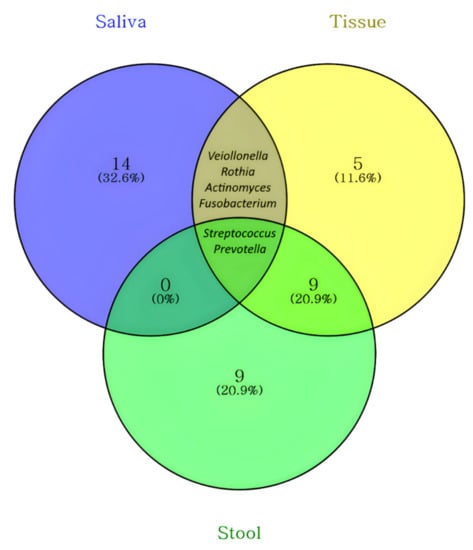 The 20 most abundant genera in the saliva, stool, and tissue are listed in Table 2A–C in order of relative abundance. Figure 5 shows a Venn diagram of these 20 genera with an inclusion relationship, and the names of the elements are listed in Table 3. Prevotella and Streptococcus were common among the three sample types. Fusobacterium, Actinomyces, Rothia, and Veiollonella were found in common in saliva and tissue samples.