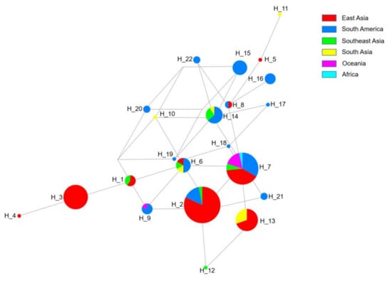 - Bandelt, H.J.; Forster, P.; Röhl, A. Median-joining networks for inferring intraspecific phylogenies. Mol. Biol. Evol. 1999, 16, 37–48. [Google Scholar] [CrossRef]