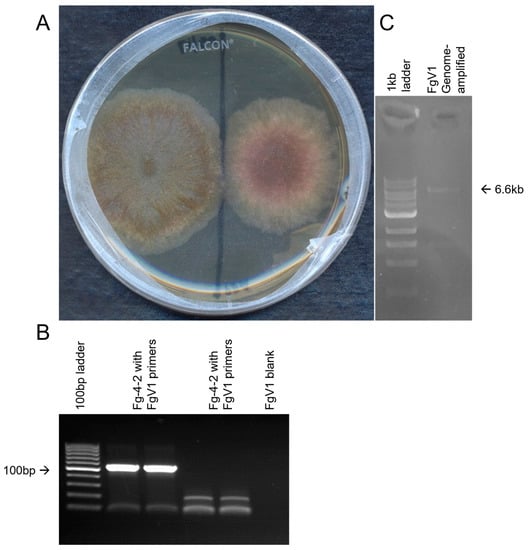 Figure 1. Morphological differences were observed between strains Fg-4-2 infected by FgV1-SD4 and Fg-4-1 that was cured of FgV1-SD4. FgV1-SD4 was detected by RT-PCR in strain Fg-4-2 but not in strain Fg-4-1. (A) Comparison of growth of Fg-4-1 (left) vs. Fg-4-2 (right) on PDA plates 5 days; (B) gel image confirming the detection of FgV1 viral genome in Fg-4-2 isolate of F. graminearum. (C) Amplification of the whole viral genome of FgV1 from cDNA.