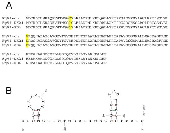 Upon sequence analysis comparing the FgV1 ORF-2 between the hypovirulent and non-hypovirulent strains, we noticed that residues I19T and D41G were the same for the hypovirulent FgV1-DK21 and FgV1-SD4 strains but were different for the non-hypovirulent FgV1-ch strain (Figure 2A). In addition, the 3′-UTR was speculated to be the possible origin of hypovirulence [14], and the predicted RNA secondary structure shows that strain FgV1-SD4 has a different detailed structure, although still with two stem-loops (Figure 2B).