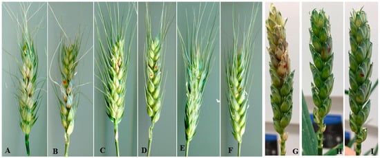 Figure 3. Photos showing typic symptoms of FHB on spikes of wheat genotype NIL-S (AF) and Y1193-06 (GI) one (in case of Y1193-06) or two weeks (in case of NIL-S) post inoculation with the F. graminearum isolate Fg-4-1 (A,B,G), Fg-4-2 (C,D,H), or water (E,F,I). Red spots indicate the inoculated spikelets.