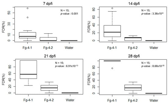 FDR was calculated at 7, 14, 21, and 28 days post Fusarium inoculation (dpi) with either Fg-4-1, Fg-4-2, or sterile water on the flowering spikelets (Figure 4). Our results show that FDR was significantly higher in the Fg-4-1-inoculated spikes compared to the Fg-4-2-inoculated spikes in all four time points analyzed. Similarly, FDK and the total number of kernels harvested per spike were also analyzed (Figure 5). FDK was also found to be significantly higher in the Fg-4-1-inoculated spikes compared to the Fg-4-2-inoculated ones. Additionally, the number of kernels per spike was significantly lower in the Fg-4-1-inoculated spikes compared to the Fg-4-2-inoculated spikes (Figure 5).