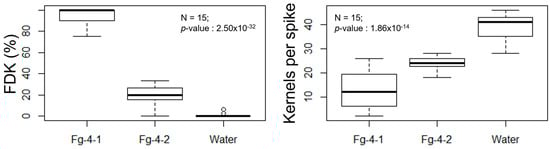 For disease evaluation, Fusarium-damaged rachides (FDR) were calculated as percentage of diseased rachides of all rachides per spike and Fusarium-damaged kernels (FDK) were calculated as percentage of diseased kernels of all harvested kernels per spike. FDR data were averaged per time-point per treatment per experiment at 7, 14, 21, and 28 dpi, respectively. Similar approach was taken to analyze FDK data per treatment. Total number of kernels per spike was also counted, averaged, and compared between three treatment groups. DON content in the harvested kernels per spike was measured by the DON testing lab at University of Minnesota and analyzed for each treatment in our lab.