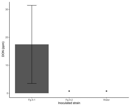 Figure 6. Deoxynivalenol (DON) toxin accumulation after inoculation of wheat line NIL-S with F. graminearum isolates Fg-4-1 and Fg-4-2, and sterile water. DON is accumulated in virus-free strain Fg-4-1; however, FgV1-SD4 infection appears to abolish DON production in strain Fg-4-2. * indicates DON undetected.