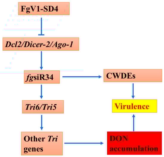 Figure 7. Proposed model of DON regulation in F. graminearum by FgV1 infection. The expression of fgsiR34 in F. graminearum is indirectly suppressed by FgV1-SD4 through suppression of Ago1/Dicer-2/dcl2 by the virus. This ultimately results in decreased biosynthesis of DON through downregulation of Tri genes in FHB as fgsiR34 regulates the expression of Tri6/Tri5 genes. fgsiR34 also regulates expression of cell wall degrading enzymes (CWDEs) impacting the virulence of the fungus.