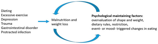 Unfortunately, the time from AN onset to treatment initiation is often unreasonably long [2], with one study finding that there was a mean of 30 months in adults and adolescents from the debut of symptoms to the start of treatment [2]. Although early intervention should have priority, few therapists have extensive experience with the early stages of AN [10,11]. However, based on the existing literature and clinical experiences, a model for AN development and maintenance is described in Figure 1.