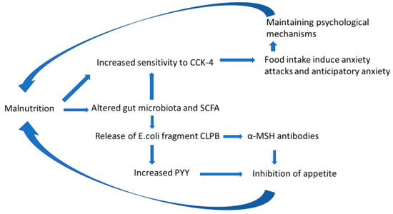 The proposed hypothesis is based on the observation that the initial weight loss, which seems to be the first step in AN development, is often induced by voluntary dieting but also be caused by psychiatric or somatic diseases (Figure 1). During this weight loss, appetite regulation might be disturbed by an increased release of gut bacterial fragments with the capacity to reduce food intake and a malnutrition-induced decrease in bacterial SCFA release. Malnutrition- or exercise-induced immunological reactions may also be part of an appetite regulation problem [74]. Malnutrition-induced increased sensitivity to CCK-4 may induce anxiety reactions during meals. As a consequence, patients develop anticipatory anxiety, the overvaluation of their body shape and weight, and misconceptions about their body shape and size (Figure 2).