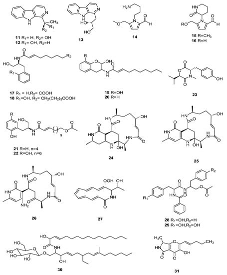 A cordycepic pigment cordycepene (27) was identified from C. militaris, and it had remarkable DPPH radical-scavenging activity; the IC50 was 0.81 mg/mL in antioxidant assays. In anti-aging assays, the activities of CAT, GSH-Px and SOD increased by 201.05%, 708.26% and 341.50%, respectively, and the degree of MDA decreased by 29.92%, when the concentration of compound 27 enhanced from 0 to 50 μg/mL [32]. Two new compounds, cordyceamides A (28) and B (29), were separated from C. sinensis (BERK.) SACC. Compounds 28 and 29 had cytotoxic effects on the cells of lines A375, L929 and Hela [33]. A new cerebroside, cordycerebroside B (30), was isolated from C. militaris and showed remarkable inhibition activity against PTP1B with an IC50 value of 4.68 ± 0.18 μM [34]. A new lactam-fused 4-pyrone cordylactam (31) was obtained from the Cordyceps sp. BCC 12671; however, its biological activity was not tested [35]. The structures of 11–31 are shown in Figure 2.