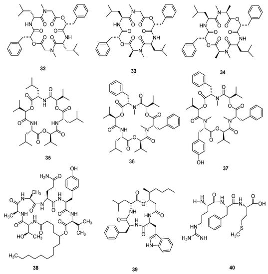 Cardinalisamides A–C (32–34) were separated from C. cardinalis NBRC 103832. Cardinalisamides A–C showed antitrypanosomal activity against Trypanosoma brucei and their IC50 were 8.56, 8.65 and 8.63 mg/mL, respectively, in vitro, and had IC50 values of 18.48, 14.00 and 23.84 mg/mL, respectively, against normal human diploid fibroblasts (MRC-5 cells) in cytotoxicity assays [36]. Cordycecin A (35) and two known compounds beauvericins E (36) and J (37) were separated from the ascocarps and insect-body tranches of C. cicadae. Beauvericin J (37) was cytotoxic against HepG2 and HepG2/ADM cells, whose IC50 values were in the range of 5.04 ± 0.20 μM and 2.67 ± 0.09 μM, respectively; beauvericin E (36) revealed moderate inhibitory effects and its IC50 value was in the range of 13.67 ± 2.59 μM and 14.48 ± 1.68 μM, respectively [37]. Cordycommunin (38) was separated from the Ophiocordyceps communis BCC 16475 and it had a growth inhibiting effect on Mycobacterium tuberculosis H37Ra and its MIC value was 15 µM. Compound 38 also exhibited slight cytotoxicity to KB cells and its IC50 value was 45 µM [38]. Beauverolide Jb (39) was obtained from C. javanica [39]. A tripeptide, arginylphenylalanyl-methionine (40), isolated from C. gunnii, with the molecular formula of C20H32N6O4S, is a sedative and hypnotic active substance [40]. Other polypeptide compounds have had less report published in recent years. However, recent studies have shown that cordyceps polypeptide complexes are helpful for improving learning and memory, but their mechanism of action needs further study [41]. The structures of 32–40 are shown in Figure 3.
