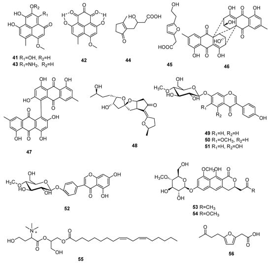 Four novel isoflavone methyl-glycosides, daidzein 7-O-β-D-glucoside 4″-O-methylate (49), glycitein 7-O-β-D-glucoside 4″-O-methylate (50), genistein 7-O-β-D-glucoside 4″-O-methylate (51) and genistein 4′-O-β-D-glucoside 4″-O-methylate (52) were obtained from C. militaris which was grown on germinated soybeans. Compound 52 showed marked antiallergic activity [46]. Three new compounds fumosoroseanosides A (53) and B (54) and fumosoroseain A (55) were isolated from C. fumosorosea. At experimental doses of 10–30 μg, compounds 53 and 54 exhibited excellent (p < 0.05) antibacterial and antifungal activity compared to the negative control group. In a range of concentrations from 100 μM to 400 μM, compound 55 could lengthen the life of nematodes; at 200 μM, it showed optimal activity (p < 0.05), and the average life of the nematodes was lengthened by 11.3% [47]. The structures of 41–56 are shown in Figure 4.