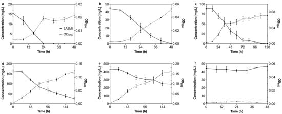 Effect of initial 3A5MI concentrations on its degradation by Nocardioides sp. N39. (a) 15 mg/L; (b) 45 mg/L; (c) 90 mg/L; (d) 165 mg/L; (e) 430 mg/L; (f) control checks of 3A5MI degradation without the inoculation of N39 and the growth of N39 without the addition of 3A5MI and any other carbon source. Symbols are shown in the figure.