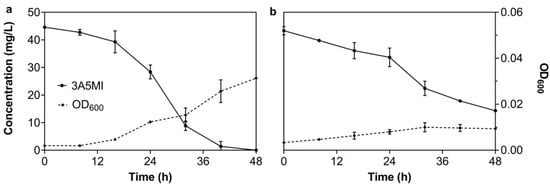 To verify the oxygen demand of N39 during the degradation of 3A5MI, the degradation experiments under anaerobic (closed bottles filled with pure nitrogen) and mionectic conditions (air-permeable but statically cultured) were executed. The results in Figure 2 illustrate that N39 was functional under both mionectic and anaerobic conditions. About 45 mg/L of 3A5MI was degraded within 48 h under mionectic conditions, and the growth of N39 increased from OD600 0.002 to 0.031 (Figure 2a). Obvious degradation was also observed under the anaerobic conditions; 63.24 ± 9.61% of 3A5MI was catabolized within 48 h (Figure 2b). N39 grew slightly as the OD600 increased from 0.002 to 0.008 ± 0.002. These results suggested that N39 was functional in both oxygen-enriched and hypoxic conditions, showing its strong potential for environmental remediation, especially in deep water or soil.