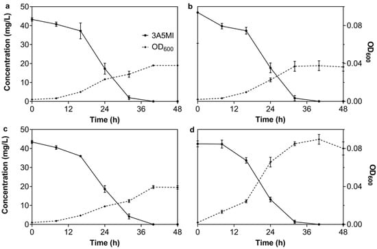A single colony of N39 formed on an LB plate was inoculated into a test tube containing 5 mL of MSM medium—with 100 mg/L 3A5MI as the sole carbon and nitrogen source—and cultured at 30 °C and 160 rpm. The expansion of the culture was carried out in a 250 mL flask with 100 mL MSM with 500 mg/L 3A5MI. Cells of N39 in the stationary phase were harvested and centrifuged at 7000× g for 10 min, washed three times with sterile MSM and re-suspended in a sterile saline solution to a final OD600 of 0.2. Then, 1% (V/V) of the cell suspension was inoculated to a new 250 mL flask with 100 mL MSM for the degradation experiment. The inspection factors with an effect on 3A5MI degradation include the initial 3A5MI concentration, pH value, temperature, additional carbon or nitrogen source and dissolved oxygen. The initial 3A5MI concentration, pH value, temperature and shaking speed were set as 50 mg/L, 7.0, 30 °C and 160 rpm, respectively, when they were not the investigated factors.