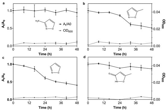 To investigate the applicability of N39 for degrading 3A5MI analogs, its degrading ability with respect to other 3A5MI analogs was tested, including 3AI, 5MI, isoxazole and hymexazol. The results in Figure 4 show that the concentration of 5MI and isoxazole decreased obviously within 48 h, but N39 did not grow. While the decrease in 3AI was negligible and the decrease in hymexazol was slight, N39 did not grow either. This phenomenon may be ascribed to the fact that the enzymes in N39 were functional in degrading them, but the degradation products could not be utilized as growth substrates. Alternatively, it could be ascribed to the possibility of the hysteresis of bacterial growth compared to the substrate utilization. In general, the degradation of the 3A5MI analogs implied the great potential of N39 in the bioremediation of the environments contaminated by such compounds.