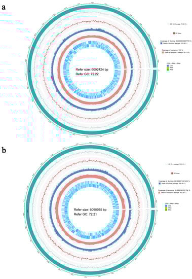The nuclear genome circle diagrams of Nocardioides sp. N39 (a) and N40 (b). From outside to inside: the reference species genome sequence information; the GC content curve of the reference genome sequence; the GC skew curve of the reference genome sequence; Illumina sequencing depth and coverage information; Nanopore sequencing depth and coverage information; the gene coding region (CDS) and non-coding RNA regions (rRNA, tRNA) in the reference genome, respectively.