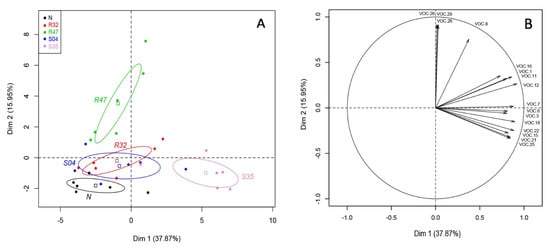 Principal component analysis of the volatiles emitted by leaves inoculated with Pseudomonas strains. (A) Score Plot of PC1 and PC2 of potato leaves non-inoculated (N) or inoculated with different Pseudomonas strains (R32, R47, S04, S35) following PCA. Superimposed on the plot are mean scores on the components for qualitative variables that are included in the PCA command and the colored ellipses illustrating the 95% confidence interval with each score. (B) Results of principal components analysis (PCA): projection on two first factors (PC1 and PC2) of the VOCs with a cosinus square superior to 0.6. VOC.1: 2-methyl-3-methylthiofuran; VOC.3: dimethyl disulfide, VOC.6: dimethyl trisulfide, VOC.7: methanethiol, VOC.8: thiocyanic methylester, VOC.11: 3-pentanone, VOC.12: Unknown 5C, VOC.15: hexanal, VOC.16: 1-undecene, VOC.18: 2-heptanone, VOC.21: (Z)-2-heptenal, VOC.22: 6-octene-2-one, VOC.25: (E)-2-octenal, VOC.26: putative, longiverbenone or isomer, VOC.28: Cyclobutane, tetrakis (1-methylethylidene)-, VOC.29: (2,6,6-trimethylcyclohexen-1-yl) methylsulfonylbenzene.