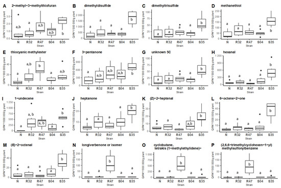 Comparative emission of VOCs by different Pseudomonas inoculated on potato leaves. Boxplot of the 16 VOCs with a cosinus square superior to 0.6 according to the two first dimensions of the principal component analysis (A–P). Tukey HSD post-hoc tests with Holm correction were performed on each VOC between potato leaves non-inoculated (N) or inoculated with different Pseudomonas strains (R32, R47, S04, S35; N = 6; Quantitative Ion Peak Area/g plant (QIPA/g plant)). Different letters indicate statistically significant differences at a significance level of p < 0.05).