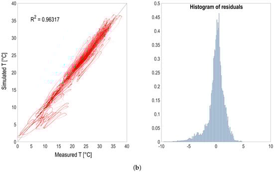 Heat transfer model validation over one year of experimental measurements for the HRABP located in Narbonne (F). (a) measured and simulated temperature. (b) correlation with measurements and distribution of error residuals.