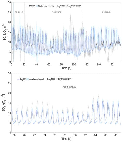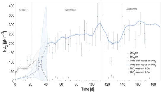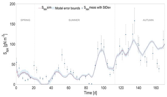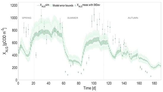 In order to evaluate the overall model prediction capability when the physical and the biological models are coupled, the predicted temperature, instead of the one measured with the probe, was used to simulate the dynamics of the biological process over the 6-month period. The most relevant model state variables are reported in Figure 4, Figure 5, Figure 6 and Figure 7, and compared with the experimental measurements, their standard deviations, and the error bounds for model predictions.