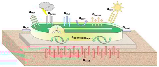 where is the pond temperature (K); is the density of pond water (kg m); is the specific heat capacity of the pond water (J kg K); and V is the pond volume (m). is the radiation from the pond surface (W); is the total (direct + diffuse) solar radiation (W); and is the radiation from the air of the pond (W). is the evaporation flux (W), is the convective flux at the pond surface (W); is the heat flux associated with the influent water (W); is the heat flux associated to the effluent water (W); and is the heat flux related to rain (W).