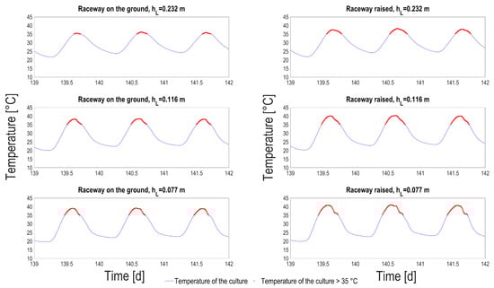 Looking at the medium temperature ranges in each situation, it turns out that the temperature oscillations when the pond is not connected to the ground is of much larger amplitude. The average number of hours per day when the temperature is higher than 35 C was computed, according to season (Table 2). This temperature was identified by Bechét et al. [25] as a lethal temperature for many species, with dramatic consequences in terms of viability [26]. In summer, on average 4 h per day a temperature higher than 35 C can be reached, for the thinnest process raised above the ground. This daily average is reduced to 2 h for the raceway on the ground. It is lower for liquid depth of 0.2 m, but it is still larger than 1 h per day. A closer look at extreme events (see Figure 9) shows that, for the hottest days, the medium stays more than 7 h above the critical threshold, which is likely to lead to the culture crash. A side effect of these high temperature is that evaporation losses are much higher in the raised HRABP, with an average increase by 20%.