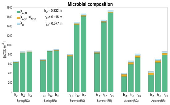 Ecosystem composition during the experimental campaign carried out in the north of Italy: (a) expressed in concentration (gCOD m); (b) expressed in percentage (%). Algae are reported on the left axis, while heterotrophic and nitrifying bacteria are on the right axis, in both figures (a,b). Simulations are from May to November 2016.