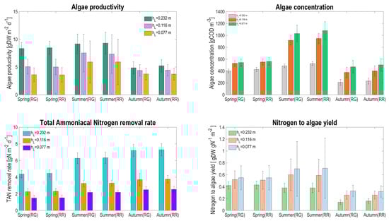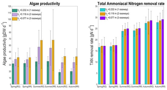 In order to assess the HRABP performances according to the two reactor configurations and the different liquid depths, the algal biomass productivity (), the total ammoniacal nitrogen removal rate (), and the nitrogen-to-algae yield () were used as key performance indicators and computed as follows: